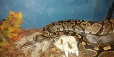 Puddles is our beautiful ball python also referred to as a "royal" python. Ball pythons are a smaller constrictor and a popular pet due to its docile temperament. Puddles was part of a hoarding situation and neglected. When we received her she was literally all skin and bones. If you've ever seen a snake skeleton then you know they look like one giant rib cage. Puddles required intensive care and force feeding to bring her back to her now healthy state. She was one of the lucky ones on this situation.