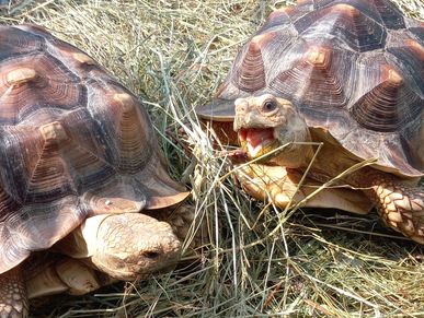 Cruiser and Sheldon are sulcata tortoises. Sulcata tortoises are third largest tortoise species in the world. Cruiser came to us from a family in NJ. Sheldon came from Jim Thorpe PA. Both boys just got too big for their families. Fully grown sulcata tortoises can weight over 200 pounds and live up to 100 years.