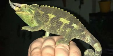 Rango is a tropical Jackson's Chameleon! Rango was donated to us because his mom was going to college and could no longer care for him. Did you know Rango has a tongue that can grab a bug almost a foot away! No bug can ever escape Rango! While hanging on to the branch with his claws and prehensile tail Rango sizes up the bug and snatches it! Rango's favorite food is hornworms and crickets.
